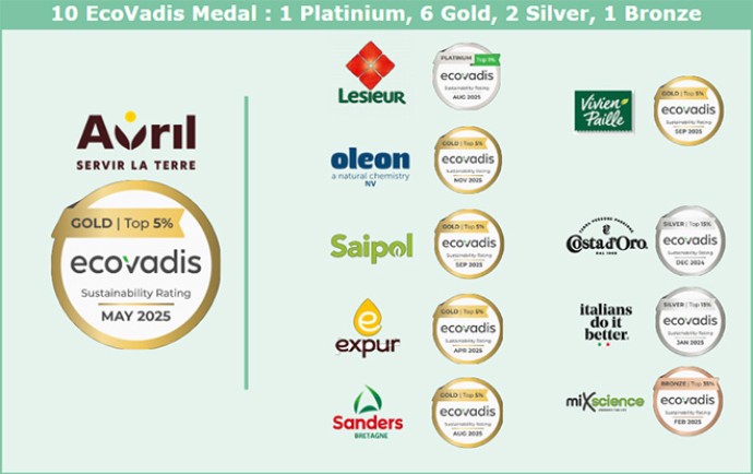 Avec un score de 79/100, Avril se positionne dans le top 3% des entreprises les plus performantes en matière de développement durable. Une progression de +8 points en un an, qui témoigne de la volonté du Groupe d’agir pour Servir la Terre, notre raison d’être, à travers des pratiques environnementales, sociales, éthiques et responsables.
